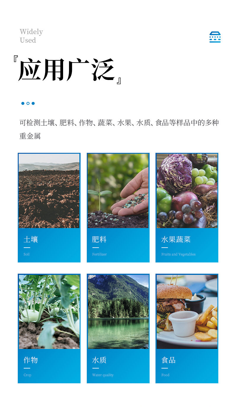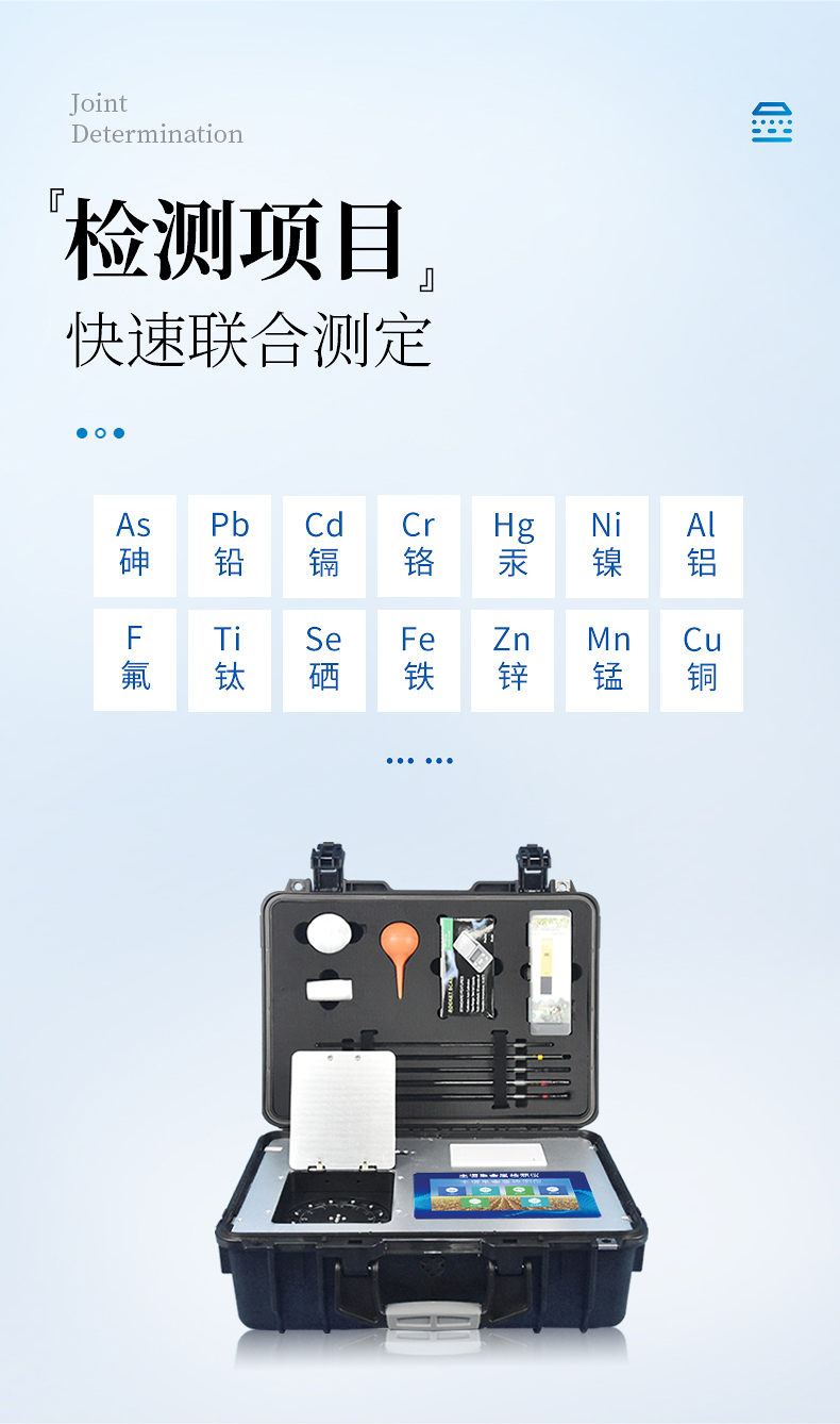 可对土壤、肥料、作物、蔬菜、水果、水质、食品等样品中的砷、铅、镉、铬、汞、镍、铝、氟、钛、硒、铁、铝、锌、锰、铜等进行快速联合测定。
